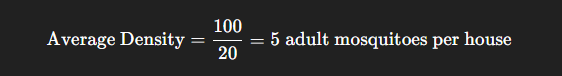 - If an insect collector inspects 20 houses & collects a total of 100 adult Aedes aegypti mosquitoes, the average density per house will be