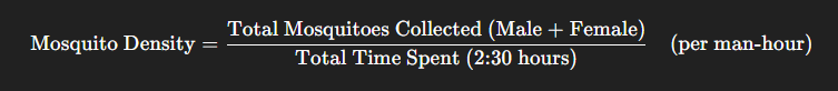- If an insect collector inspects 10 houses & collects a total of 100 adult Aedes aegypti (male and female) mosquitoes during 2 hours and 30 minutes, the density of mosquitoes per man-hour will be:
