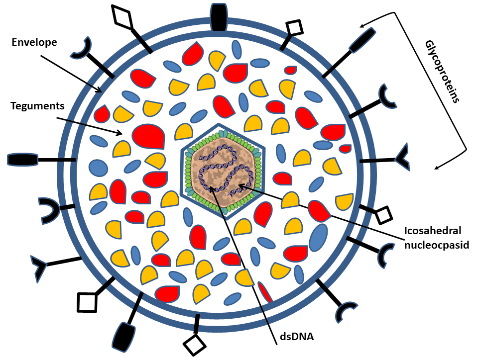 The intact infectious particle is called a virion and shows a clearly defined outer envelope, tegument, and dense nucleocapsid in electron micrographs.